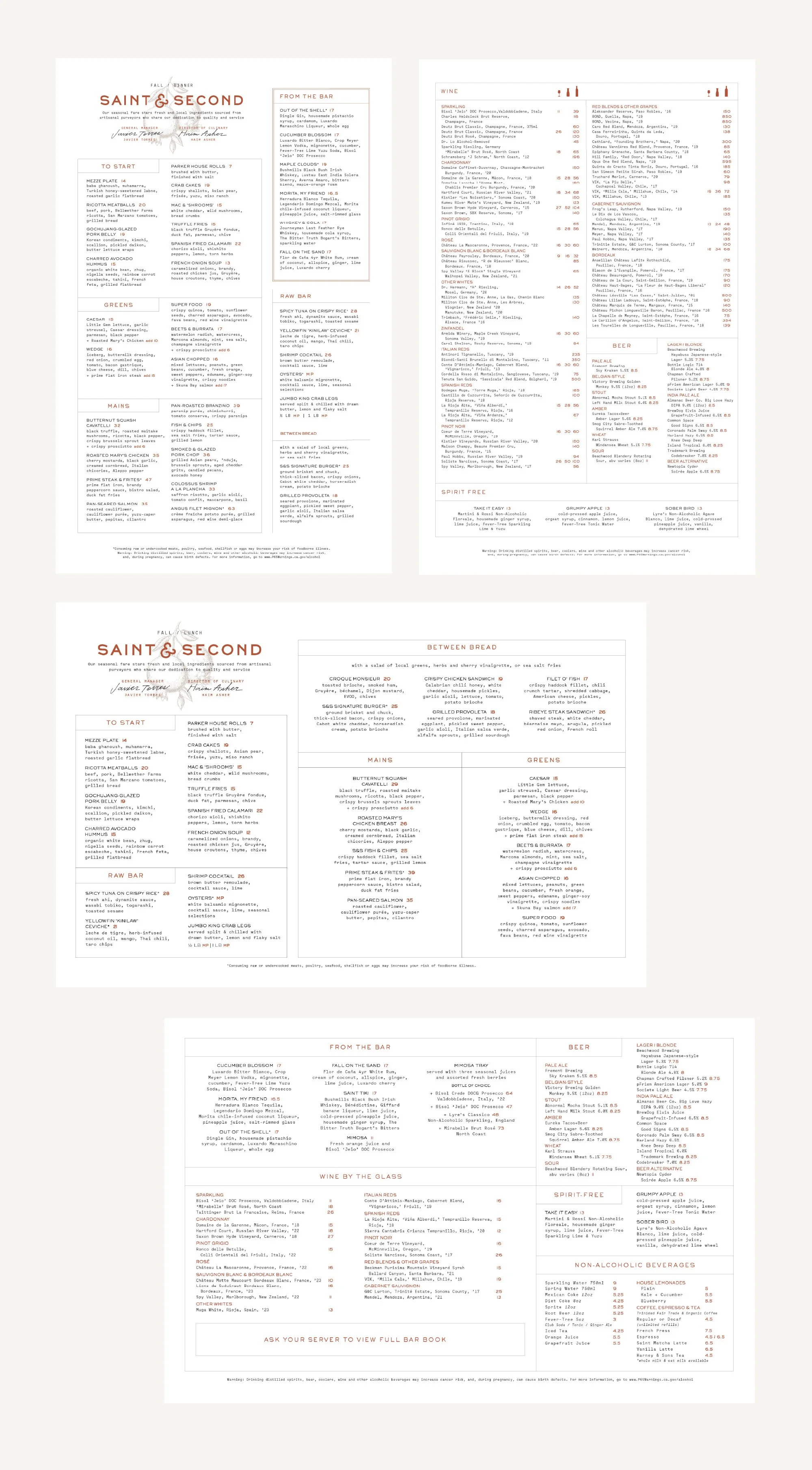 Menu redesign for dinner, brunch, lunch, and bar book